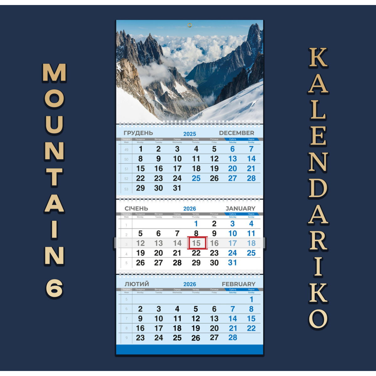 Цей календар створений для тих, хто надихається природою гір. У ньому поєднуються зручний формат для планування та чудові зображення величних гірських пейзажів. Щомісяця перед вами відкриватимуться засніжені вершини, мальовничі долини та приголомшливі панорамні види, що подарують відчуття свободи і прагнення до нових висот.
